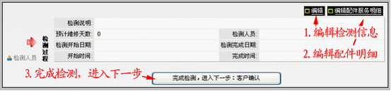 点击确认后,开始维修过程的第一步:检测。 检测过程 检测人员操作检测过程,1)记录检测信息 2)根据检测结果记录需要使用的配件和维修服务明细3)点击完成检测的按钮,如下图所示: