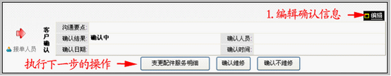 在编辑检测信息时,需要注意: 检测说明:需详细填写检测结果; 预计维修天数:填写天数,比如2。则会在开始维修后,根据预计维修天数自动计算出维修完成日期(只在选择方式3时有效) 编辑配件和服务明细的方法,请参见方式2中“变更配件服务明细”。 这两步操作完后: 点击“完成检测,进入下一步:客户确认” 看到提示如下: