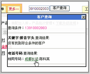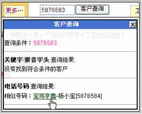 菜单中客户查询支持用电话查客户 操作 在菜单条上的客户查询中,支持输入电话号码查找客户的功能。 即可以实现号码的精确匹配查找(如上图),也可实现模糊匹配查找(如下图): 模糊查询出的相似号码,规则时:只有末尾两位不同。