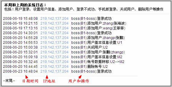 每条记录都有日期时间、登录IP、用户和操作等详细数据,对CRM的安全应用起到日志备查作用。