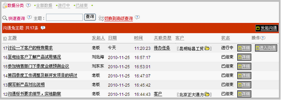 关联类型:表明沟通主题是针对什么发起的;关联类型为空的,是直接在我的沟通兔在线界面/ChatTool发起的沟通。 沟通状态:进行中,结束。当天发起的沟通,状态均为进行中;XToolCRM系统每天凌晨自动将前一天发起的所有沟通结束,使其状态更改为结束。 |