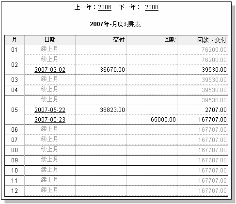 说明: 往来对账的作用是把客户的回款,和给该客户的发货流水按月的方式,提供一个汇总。 对于一些按月结算的销售模式,可以直接看出结算额。 对于普通方式销售的用户,也可以通过往来对账,查看发货和回款的差异。 操作方法: 1.在客户视图的右侧,看到如下图所示模块: 2.点击“交付/回款 月度对帐>>” 看到往来的对帐表,如下图: