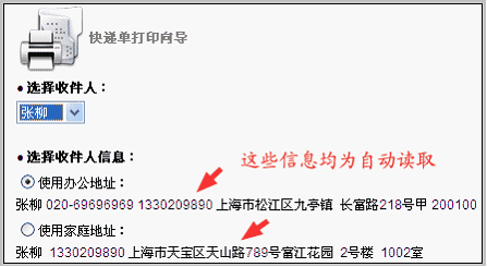 3)进入打印向导,自动读取发货单上的收货人、地址、电话等数据,举例如下: