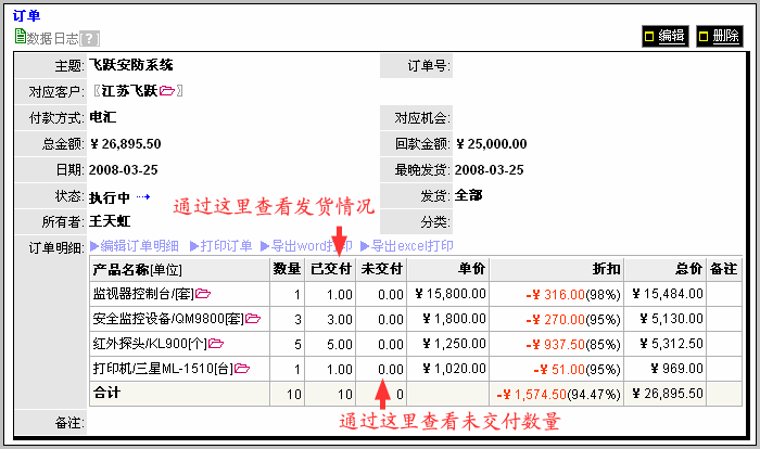 发货情况和未交付数量,是订单根据与之关联的发货单自动统计得出的,不需要手工修订。