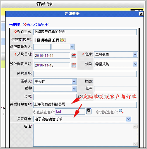 说明 适用于:贸易公司,按照客户的订单采购。按订单生产型企业,根据客户订单采购原材料生产。即:可通过此功能,实现采购单与订单的关系挂接。知道该采购单是为哪一个订单的进行的。 操作 新建采购单时,确定对应客户和订单 如下图所示: