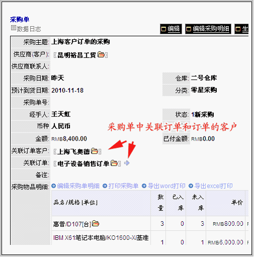 按此方法记录的采购单,即可以知道是与哪个客户哪个订单有关系的。 保存后,可在采购单视图查看内容如下: