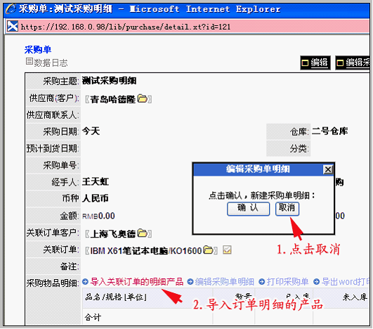 可以直接导入订单明细中的产品 在采购单视图内,可看到“导入关联订单的明细产品”功能。 您可以使用自动导入,也可以自主编辑采购明细。如下图所示: