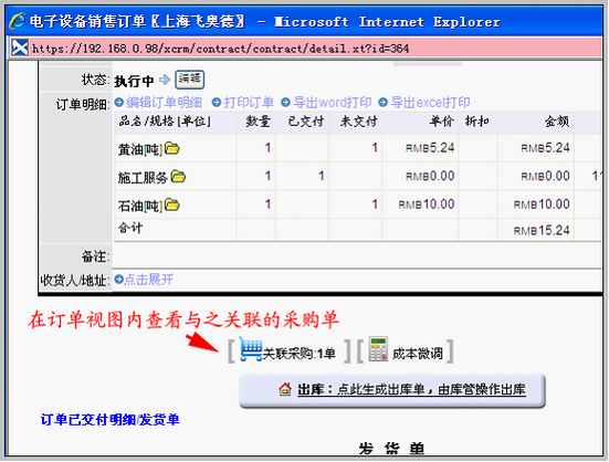 在订单视图中,可以看到关联的采购单。点击即可查看详细的采购单内容,如下图所示: