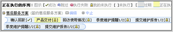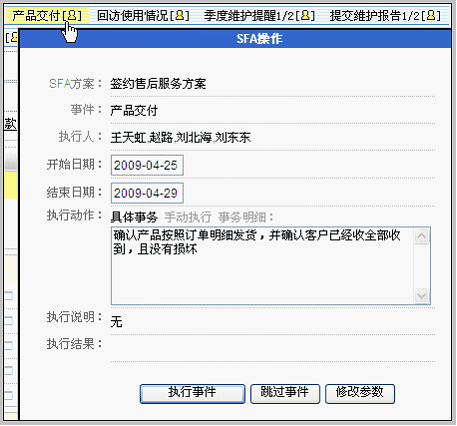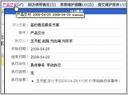 事件被执行后,事件名称后面出现绿色对勾小图,表明该事件已经被执行。如下图的产品交付事件: