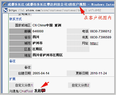 说明 若需要针对某一件事情或者某一个客户进行内部讨论,那么我们可以用XToolsCRM沟通兔/ChatTool来实现。目前,XToolsCRM沟通兔/ChatTool支持针对待办任务和客户发起沟通。下面,我们以针对客户进行沟通为例来进行讲解。 操作 进入客户视图,点击按钮发起沟通 针对客户发起沟通,需要发起人有客户的读权限,即可以进入客户视图。 步骤:进入客户视图,在客户基本信息下扩展一栏内,点击沟通兔/ChatTool后的发起按钮,如下图: