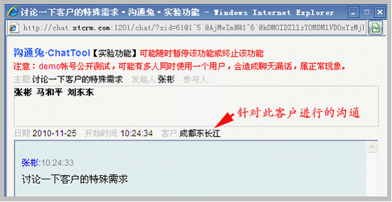 在此处发起沟通后,创建沟通主题并选择参与人,此过程和上面我们讲到的发起沟通步骤相同,不再赘述。不同的是,在沟通兔/ChatTool的沟通界面,会提示这是针对哪个客户发起的沟通,如下图: