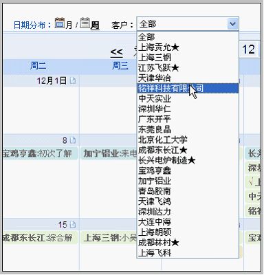 这里所显示的客户,是当前周月视图中的日程、任务和行动历史所涵盖的客户。客户名称后面带有五角星的表明该客户为热点。