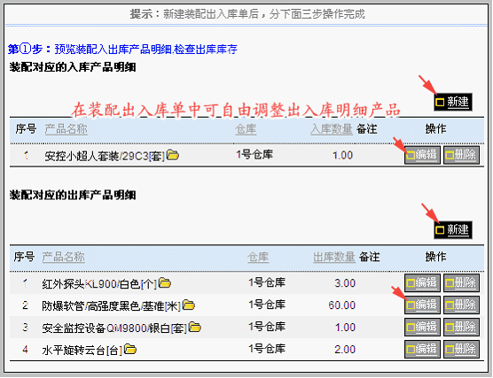 并且可以在装配出入库单中进行新建和编辑出入库产品明细,实现灵活应用。