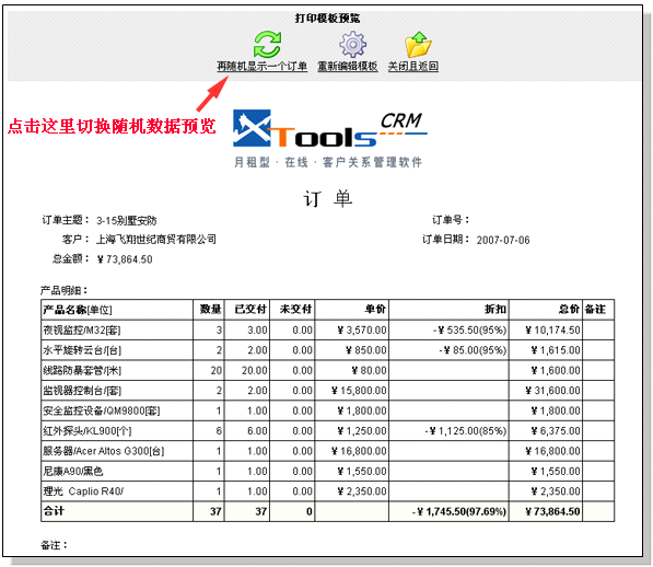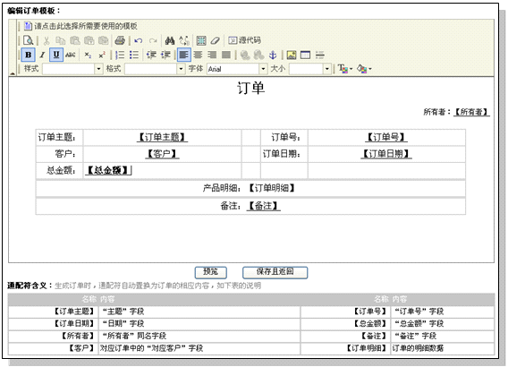 报价单、订单、发货单打印模版自定义 说明 报价单、订单和发货单的打印模版支持自定义功能,可为企业实现更个性化的打印样式。 操作 帐户菜单->系统设置->单据打印模版 编辑界面 注意,使用通配符可在生成后自动变换为数据。通配符使用时需带上两边的【】,比如【订单主题】等。 编辑模板时,可以在Word中先按照表格形式做好,并复制,然受使用编辑模板中的