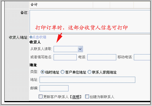 图中箭头所指部分的信息,可以在打印订单时一起打印。需要提醒您的是,这个功能并不适用于所有的企业,有些公司需要使用专门的发货单,或专门的快递单,则不需要在订单中再打印收货人信息。所以订单打印模板中,这些内容属于选用范畴。 |