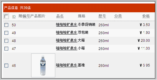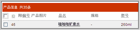 如上图所示,我们导入了规格“双包装”和“冬季促销装”。 在产品列表中查看多规格产品 前面我们新建的哇哈哈矿泉水的多规格产品,出现在产品列表中,如下图所示: