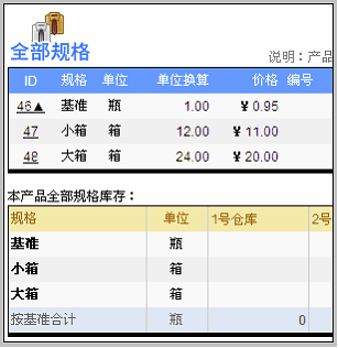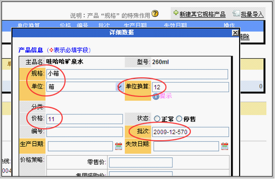 先以小箱规格为例,填写:规格名、单位和单位换算。 注意: