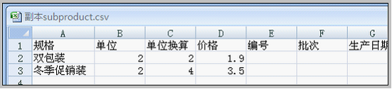 在本界面,首先确定我们要导入的是产品“哇哈哈矿泉水”的其它规格产品。然后下载模板,在模板中填写规格情况: