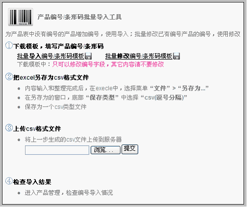 操作方法和导入客户联系人的方法类似。 不同的是:可以批量导入,也可以批量修改。这两种操作的模板不同。 注意:下载模板后,编辑编号/条码内容时,不要删除“条码:”字样,如下图: