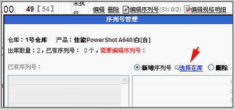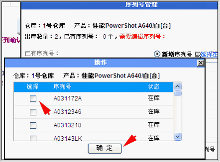 点击“选择在库”,在弹出层中看到该产品在库的序列号,可直接勾选后,点击确定即可。