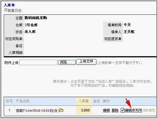 说明 仓库管理人员需要在操作序列号产品入库时,根据入库数量,录入入库的序列号。不管是采购入库还是直接入库,都是在入库单界面操作。 操作 在入库单中,编辑明细 如果入库产品中有管理序列号的产品,点击编辑序列号,如下图所示: