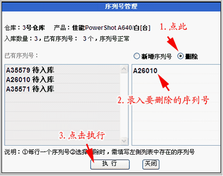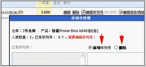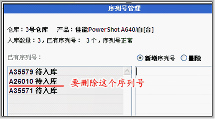 新增序列号的方法和前面录入在库SN的方法一致,不再重复讲述。 关于删除操作 什么情况下需要使用删除:在该入库单没有确认入库前,发现序列号录入有误,可以删除掉错误的,重新新增正确序列号。 举例说明:在下图中,入库单录入了3个序列号,其中A26010错误,需要删除。