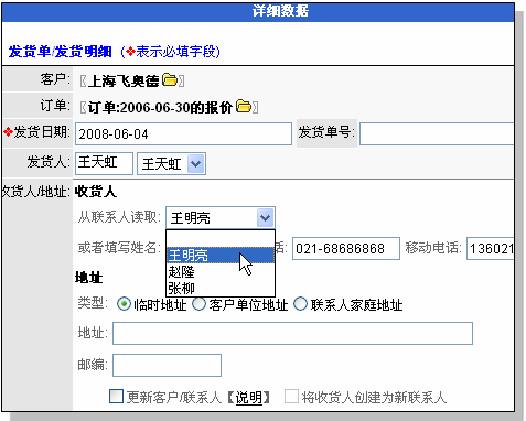 说明: 在编辑发货单时,可选择该客户的联系人作为收货人,并自动读取该联系人的地址和通信方式。 您也可以选择客户的地址作为收获地址。如果直接填写收货人在发货单,还可自动创建为该客户的新联系人。 操作: 从联系人选择收货人