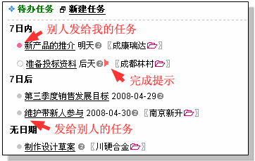 待办任务的图示说明 待办任务前面会出现各种颜色的小圆点图标,如下所示: l 我发出给别人的任务 l 别人给我的任务 m 我给自己的任务 0 我有权限看到,但并没有直接参与的任务 W 有执行人完成反馈的任务