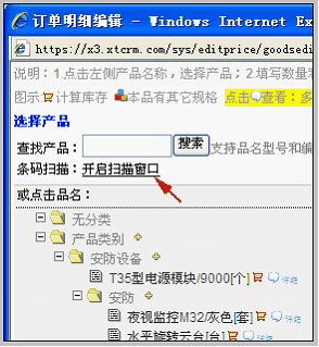 编辑订单明细时,使用条码扫描选择产品 进入订单编辑明细界面 在订单选择产品明细界面,左上角位置,可以看到“开启扫描窗口”,如下: