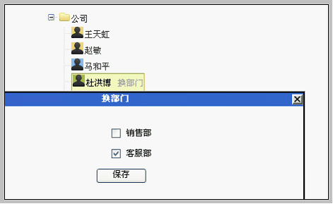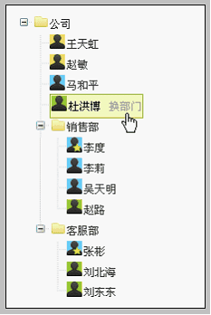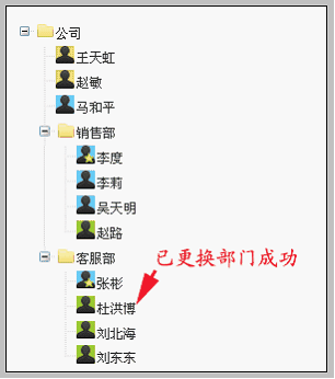 4.点击“确定”按钮,页面刷新。可以看到“杜洪博”已成功从公司根部门下调换到客服部。如下图: