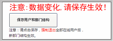 部门结构问题 “注意:数据变化,请保存生效!” 该提示说明您曾经对公司的用户或部门做过某些操作,使用户和部门结构发生了改变。 当用户和部门结构发生变化后,在您完全调整完毕时,必须操作保存使新的数据结构生效。