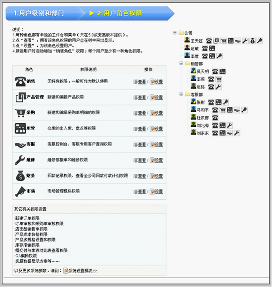 说明 每个工作人员都有主要负责的工作内容。为了让CRM系统更贴近用户的实际工作,XToolsCRM将用户工作职能分为九大角色:老板职能、销售、产品管理、采购、库管、客服、维修、财务和市场。 每种角色具有单独的工作台和功能菜单,每个用户可拥有多个角色。不仅界面清晰、容易上手,更贴近用户的使用习惯。