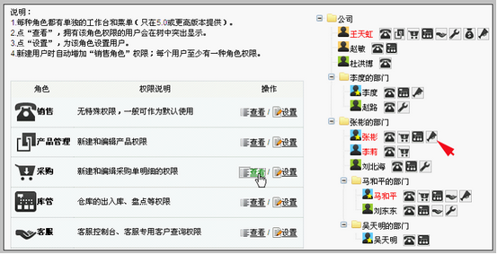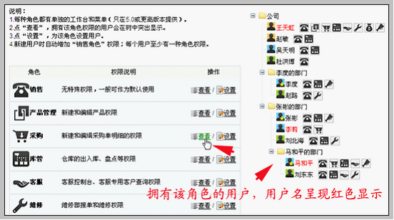角色查看 在某角色后点“查看”,拥有该角色权限的用户会在树中突出显示。通过此功能可以快速查看哪些用户拥有当前角色。 以查看拥有采购角色的用户为例。如下图: