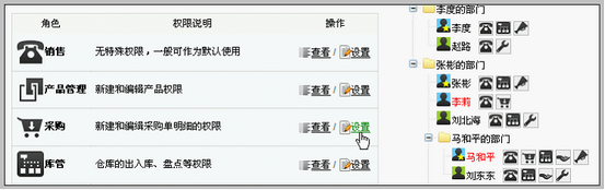 下面我们为张彬用户赋予采购角色。 点击采购角色后的“设置”,如下图: