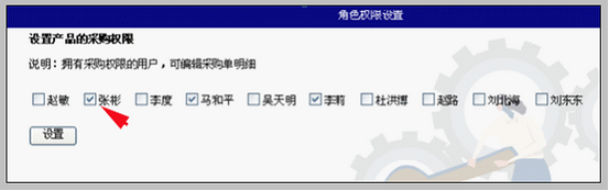 点击后,弹出“角色权限设置-设置产品的采购权限”页面,我们选择张彬,如下图:
