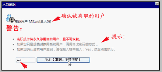 3.确认将该用户离职后,在输入框中输入“yes”,然后点击执行。系统提示操作成功,如下图:
