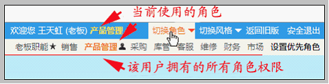切换角色 用户每次登录系统,首先进入的是已设置的优先角色工作台。可通过切换角色来使用不同角色下的功能。 在系统右上角,有“切换角色”按钮,将鼠标移动到按钮上,会显示该用户拥有的角色权限。如下图: